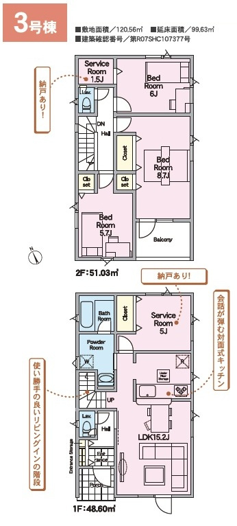 エコジョーズ / ベタ基礎(基礎断熱) / 無落雪屋根(ステイルーフ) / 全居室パネルヒーター / 全居室フローリング / 全居室エアコン設置可 / 室内物干機 / スマートキー / 散水栓 / EV車充電設備 / 郵便受け