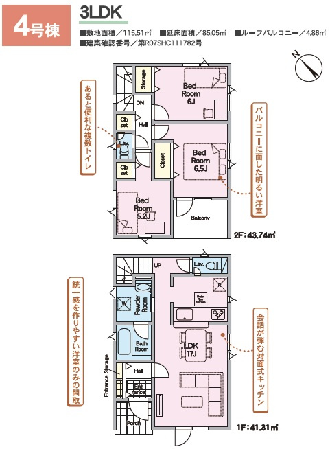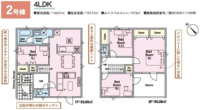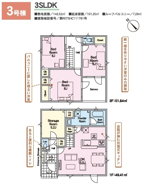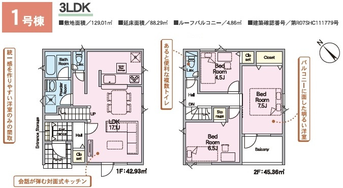 ■5号棟:土地44.58坪の4LDKで駐車3台可!ルーフバルコニー付!南西向き角地で日当たり良好!